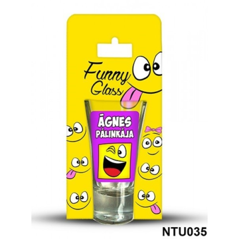 Névvel és vicces felirattal díszített pálinkás pohár. Anyaga: üveg Űrtartalom: 5 cl Befoglaló mérete: 7 x 5 x 15 cm