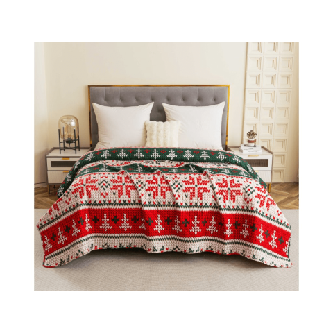 Az Ágytakaró FROSTED CHRISTMAS mintával, színes kialakítás ünnepi és otthonos megjelenést kölcsönöz a hálószobának. A kötött pulóverre emlékeztető minta piros, zöld és fehér színekben hópehely és karácsonyi fák motívum