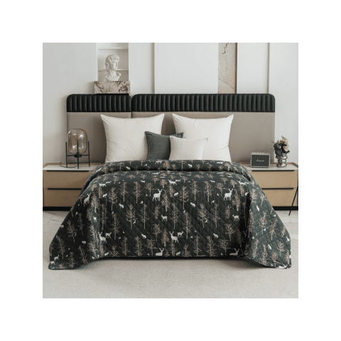 Az Ágytakaró OAK DEER mintával, sötétzöld kialakítással erdei és nyugodt természet hangulatát hozza be a hálószobájába. A finom ágainak és az erdei állatok sziluettjei harmonikus és otthonos hangulatot teremtenek, ami tö