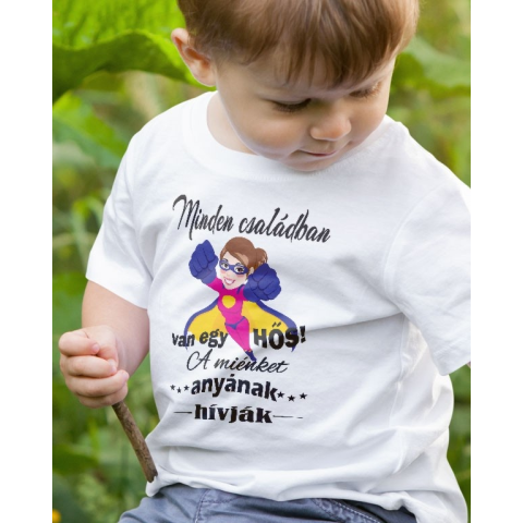 Feliratos gyerek póló anyának, egy hős anya. Minden családban van egy hős a miénket anyának hívják gyerek póló egy igazi szuperhős anyukának meglepetés. Tökéletes választás anyák napjára, születésnapra, karácsonyra is. Többféle méretű és színű 100% pamut