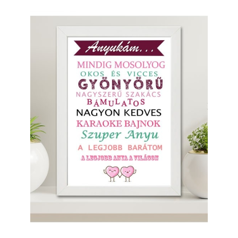 Ajándék anyának, Legjobb anya nagyméretű falikép kedves feliratokkal. Tökéletes ajándék édesanyáknak anyák napjára, születésnapra, karácsonyra. Az A3-as képkeret mérete 30x40 cm, színe fehér, falra akasztható.