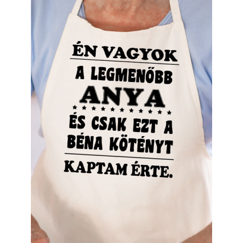 Ajándék anyának, vicces kötény édesanyáknak. Én vagyok a legmenőbb anya, és csak ezt a béna kötényt kaptam érte. Tréfás feliratos kötény fekete vagy fehér színben anyukáknak névnapra, szülinapra, karácsonyra. Anyaga vászon. Méret: 70 x 79 cm (szél. x mag.
