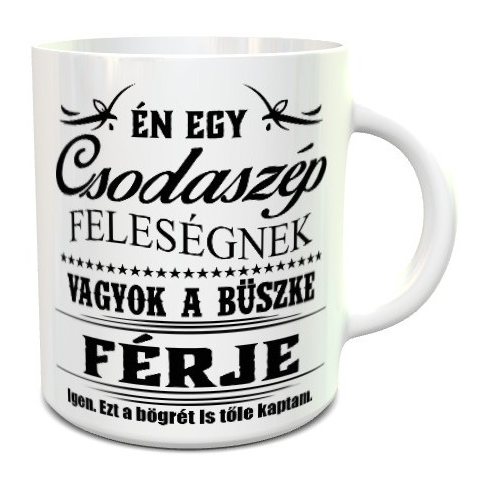 Bögre férfiaknak, feleség büszke férje. Ajándék férjeknek. Én egy csodaszép feleségnek vagyok a büszke férje feliratos bögre, többféle színben, akár díszdobozban is. Egyedi nyomtatású bögréink kiváló választások személyes ajándékként vagy mindennapi h