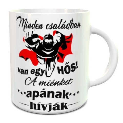 Feliratos bögre apának, egy hős apa. Minden családban van egy hős a miénket apának hívják bögre egy igazi szuperhős apukának. Tökéletes választás apák napjára, születésnapra, karácsonyra is. Rendelj mellé díszdobozt is! Egyedi nyomtatású bögréink kivál
