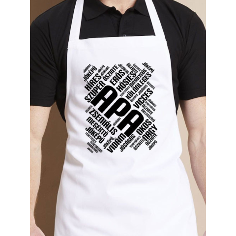 Ajándék apának. Apás kötény. Kötény férfiaknak, édesapáknak. Ajándékötlet születésnapra, névnapra apáknak kedves szavakkal. Fekete színű kötény választása esetén a minta fehér színnel kerül a termékre. Egyedi mintával ellátott kötényünk praktikus és st