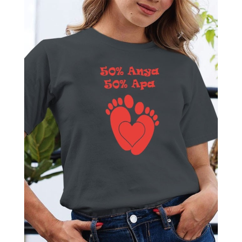 Feliratos póló apáknak, 50% anya 50% apa. Rendelj újdonsült apukának egy igazi családi pólót, ha anya és apa összetétele tökéletesen érvényesül gyermekükben. Rendelj mellé gyerek és női pólót is, így a teljes szettet viselheti a család. Pólók anyaga 100%