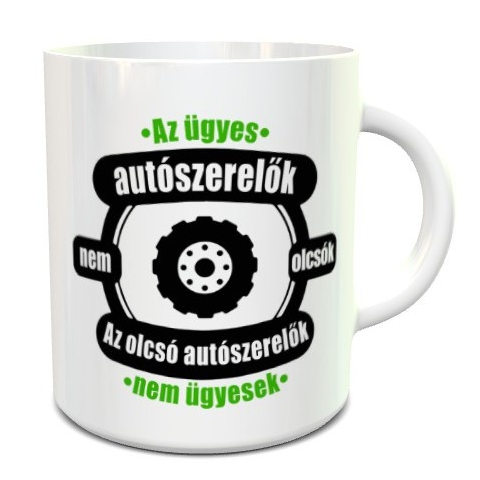 Humoros bögre, ügyes autószerelő. Az ügyes autószerelők nem olcsók, az olcsó autószerelők nem ügyesek, nagy igazság egy feliratos bögrén. Ajándék autószerelőknek, a kocsik mesterének! Műhelye, irodája dísze lehet ez a vicces bögre. Lepd meg őt vele. Válas
