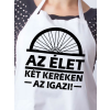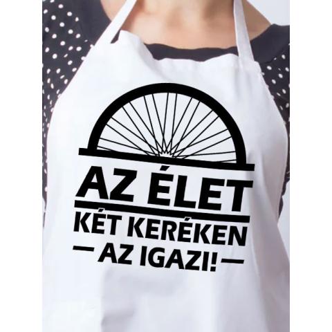 Ajándék biciklisnek, élet két keréken kötény. Feliratos kötény kerékpárosoknak. Ha szeretsz bringázni, és a konyhában is otthonosan mozogsz rendelj magadnak egy egyedi bringás kötényt, hiszen az élet két keréken az igazi. Egyedi mintával ellátott kötén
