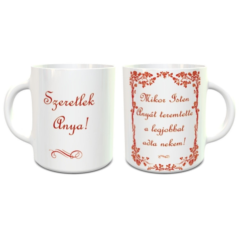 Ajándék édesanyáknak, Szeretlek anya bögre. Mikor Isten anyát termtette a legjobbat adta nekem! -egyik oldalán ez a felirat, a másik oldalán Szeretlek Anya! szöveg került erre a tökéletes anyák napi ajándékra. Anyaga kerámia, űrtartalma 3 dl. Egyedi n