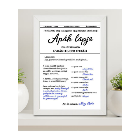 Ajándék Édesapáknak, apák lapja falikép A4. Egy lap, amely kettőtökről szól. Újságcímlap stílusú A4 méretű falikép, amely kizárólag a világ legjobb apukájának készült – egyetlen, személyre szabott példányban. Ez a kreatív ajándék lehetőséget ad arra, hogy
