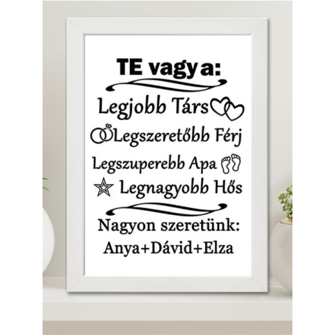 Nagyméretű falikép, ajándék férjnek és apának, Apák napi ajándék férfiaknak saját névvel, nevekkel. A kép mérete 30x40 cm, a szöveg színe szabadon válaszott. Az elkészült kép falra akasztható, tökéletes meglepetés, és lakásdekoráció egyben.