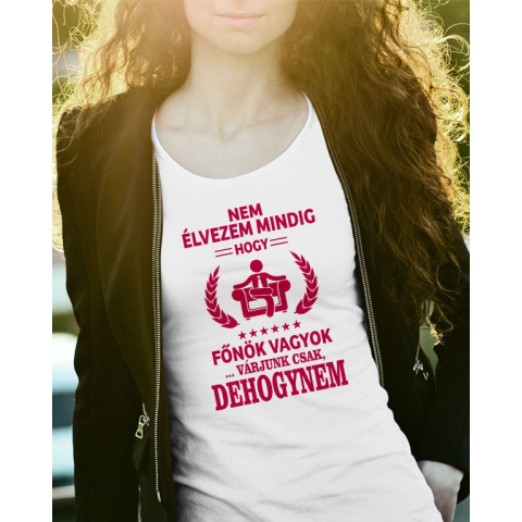Ajándék főnöknek, vicces feliratos női póló. Nem élvezem mindig, hogy főnök vagyok.. várjunk csak, dehogynem! Női póló csakis igazi főnököknek születésnapra, névnapra. Lepd meg vele családtagodat, barátnődet vagy a főnökasszonyodat. Választható színű női