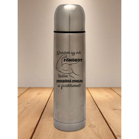 Ajándék főnöknek, vicces termosz főnöknek. Szeretnék egy erős főnököt, talán megbírná emelni a fizetésem, termosz humoros célzással. Ajándék a főnök születésnapjára, névnapjára kollégáktól. Melegen vagy hidegen is tudja tartani az italokat, űrtartalma: 50