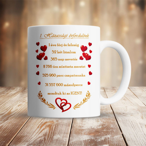 Ajándék házassági évfordulóra, feliratos bögre. Tökéletes évfordulós ajándék férjnek és feleségnek, bármely évszámmal rendelhető! Ez az egyedi bögre romantikus és személyre szabható meglepetés pároknak, amely tökéletes választás házassági évfordulóra. A