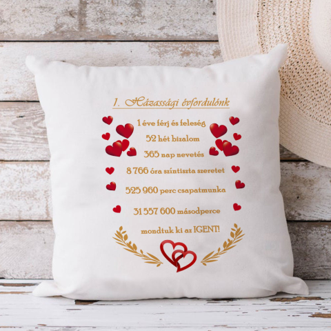 Ajándék házassági évfordulóra, feliratos párna. Tökéletes évfordulós ajándék férjnek és feleségnek, bármely évszámmal rendelhető! Ez az egyedi díszpárna romantikus és személyre szabható meglepetés pároknak, amely tökéletes választás házassági évfordulóra.