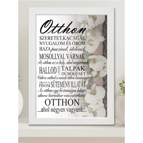 Ajándék házavatóra, lakásavatóra. Falikép nagyobb méretben, mely falra akasztható. Kedves feliratokkal, idézettel. Képkeret mérete 30x40 cm, színe fehér.