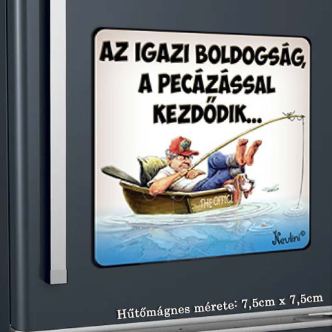 Az igazi boldogság a pecázással kezdődik – Vicces hűtőmágnes horgászoknak! Minden horgász tudja, hogy a nap igazán jól csak akkor indulhat, ha egy pecázás is belefér! Ezzel a 7,5x7,5 cm-es, 0,3 cm vastag hűtőmágnessel mindig emlékeztetheted magad (és a cs