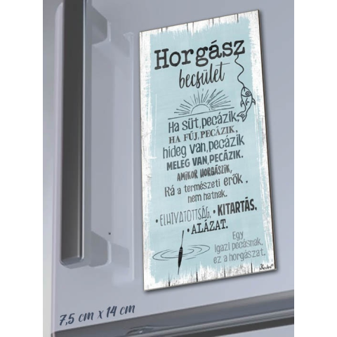 Ajándék horgászoknak, hűtőmágnes Horgász becsület felirattal. Hűtőmágnesek motivációs feliratokkal, személyes és kedves ajándék ötlet férfiaknak és nőknek egyaránt. Mérete: 7,5 x 14 cm Anyaga: fa