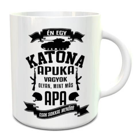 Ajándék katonáknak, bögre katona apukáknak. Én egy katona apuka vagyok, olyan mint más Apa csak sokkal menőbb feliratos meglepetés édesapáknak karácsonyra, apák napjára. Anyaga kerámia, zománc vagy üveg többféle színben akár díszdobozban is. Egyedi nyo