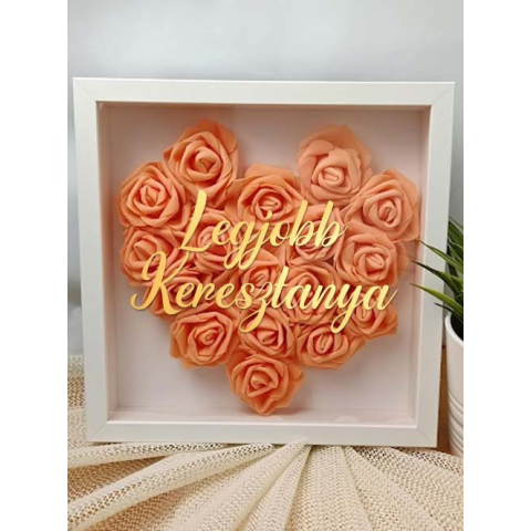 Ajándék keresztanyának. 3D virágos képkeret, falikép keresztanyának. Nagyon elegáns ajándék a Legjobb keresztanyának, mutatós dekoráció minden stílusú lakásban, és egy örök emlék Tőled. A képkeretben naracs színű rózsákból álló szívet alkottunk meg, a fel