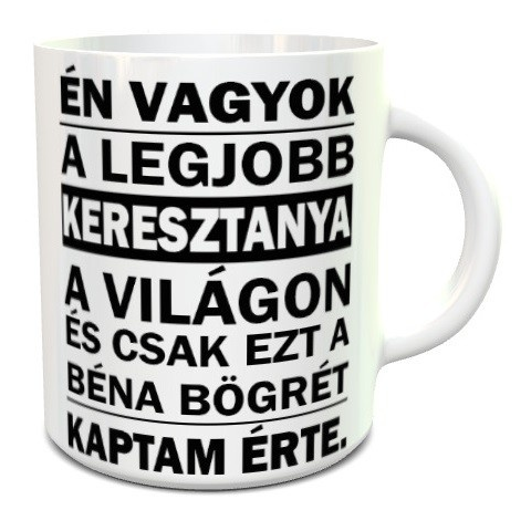 Vicces bögre keresztanyának, én vagyok a legjobb. Én vagyok a legjobb keresztanya a világon és csak ezt a béna bögrét kaptam érte humoros feliratos bögre. Válaszd anyák napjára, születésnapra ajándéknak. Rendeld meg a neked tetsző zománc, kerámia vagy víz