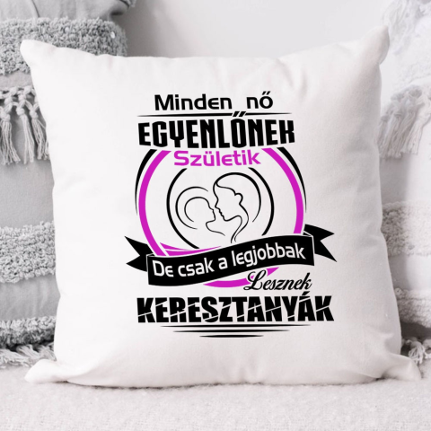 Ajándék keresztanyának, legjobb keresztanya párna. Minden nő egyenlőnek születik, de csak a legjobbak lesznek keresztanyák feliratos párna. Mérete 40x40 cm, húzózáras mosható huzat, tartalmazza a bélést is. A párna hátuljának színét kiválaszthatod. A