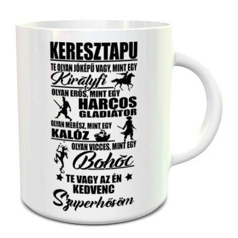 Ajándék keresztapáknak, bögre keresztapának. Mókás, kedves feliratos bögre apák napjára, születésnapra. Többféle színben rendelhető, tökéletes meglepetés bármelyik keresztszülőnek. Egyedi nyomtatású bögréink kiváló választások személyes ajándékként va