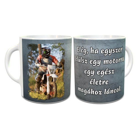 Ajándék motorosoknak, egyedi fényképes bögre, mellyel meglepheted családtagodat vagy egy barátodat, aki imádja a száguldást és a sebességet. Elég ha egyszer felülsz egy motorra, egy egész életre magához láncol. felirattal. Egyedi nyomtatású bögréink ki