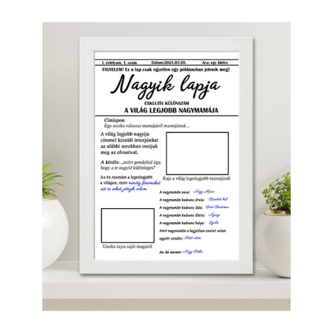 Ajándék Nagymamának, Nagyik lapja falikép A4. Egy lap, amely kettőtökről szól. Újságcímlap stílusú A4 méretű falikép, amely kizárólag a világ legjobb nagymamájának készült – egyetlen, személyre szabott példányban. Ez a kreatív ajándék lehetőséget ad arra,