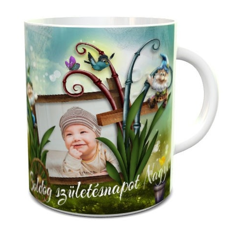 Születésnapra nagymamának, fényképes bögre. Szülinapi bögre nagymamának, saját fotóval mesefigurás képkeretben, kiváló ajándék az unoka fényképével ellátott bögre, ami a tartós nyomatnak köszönhetően örök emlék marad a nagyinak. Egyedi nyomtatású bögré