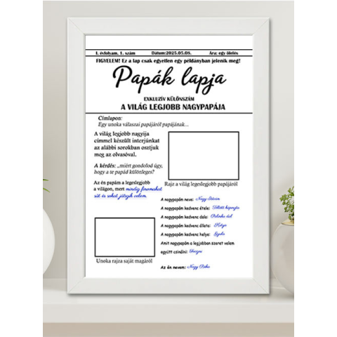 Ajándék Nagypapáknak, Papák lapja falikép A3. Egy lap, amely kettőtökről szól. Újságcímlap stílusú A3 méretű falikép, amely kizárólag a világ legjobb nagypapájának készült – egyetlen, személyre szabott példányban. Ez a kreatív ajándék lehetőséget ad arra,
