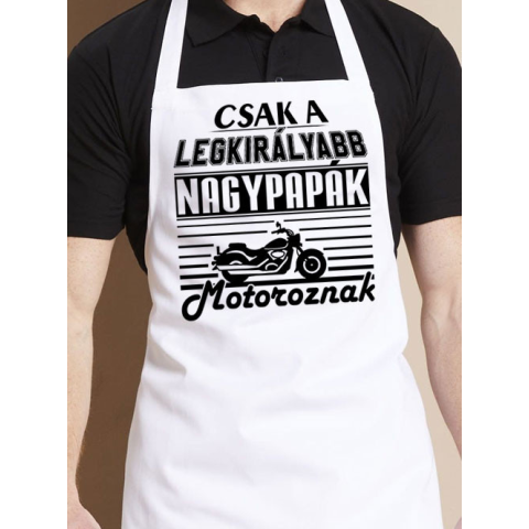 Ajándék nagypapának, motoros kötény nagypapának. Kötény férfiaknak csakis igazi motoros nagypapáknak. Csak a legkirályabb nagypapák motoroznak felirattal. Lepd meg vele nagypapádat apák napján, vagy egy motoros barátod. A kötény fekete és fehér színben is