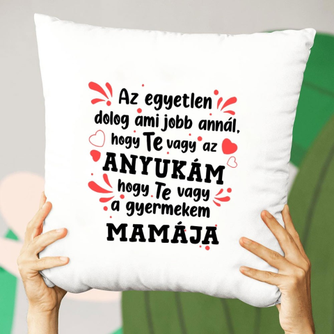 Ajándék nagyszülőknek, párna nagymamának. Az egyetlen dolog ami jobb annál, hogy Te vagy az anyukám, hogy te vagy a gyermekem mamája felirattal. Lepd meg anyukádat egy ilyen párnával, születésnapra, névnapra vagy akár karácsonyi ajándéknak is ideális vála