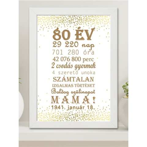 Ajándék nagyszülőnek, Boldog szülinapot Mama falikép A3 méretben, egyedi feliratokkal. Add meg a születési dátumot (a többi adatot mi ebből kiszámoljuk), a gyerekek, unokák számát, majd válassz keret és háttér színt. Képkeret mérete 30x40 cm, színe fehér.