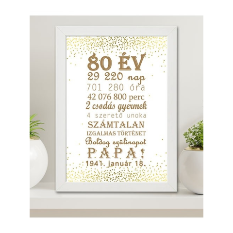 Ajándék nagyszülőnek, Boldog szülinapot Papa falikép egyedi felirattal. Add meg a születési dátumot (a többi adatot mi ebből kiszámoljuk), a gyerekek, unokák számát, majd válassz keret és háttér színt. Képkeret mérete 21x30 cm A falikép nagyobb méretben