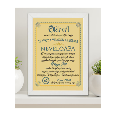 Ajándék nevelőapáknak, apák napi oklevél. Falikép, ami egy Oklevelet tartalmaz a Világ legjobb nevelőapukájának. Köszöntsd nevelőapádat apák napján, születésnapján, vagy karácsonykor egy névre szóló okirattal. Falra akasztható, illetve kitámasztójának kös