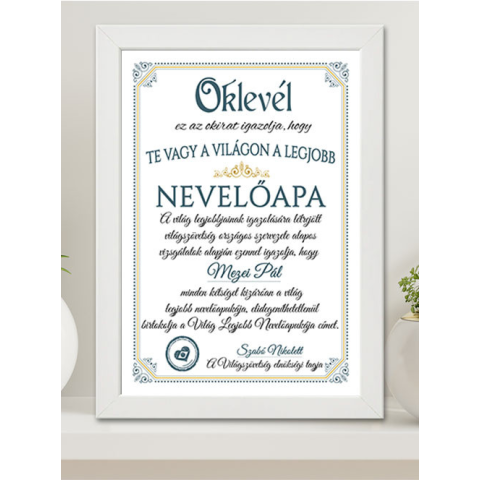 Ajándék nevelőapának, apák napi oklevél nagy. Falikép, ami egy Oklevelet tartalmaz a Világ legjobb nevelőapukájának. Köszöntsd nevelőapádat apák napján, születésnapján, vagy karácsonykor egy névre szóló okirattal. A képkeret és a háttér színe fehér, falra