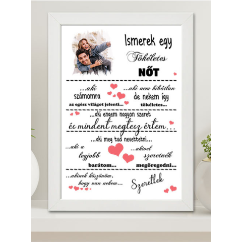 Ajándék nőknek, szerelmes nagy falikép. Évfordulóra, Valentin napra, de akár szülinapra is rendelheted barátnődnek, feleségednek közös fotótokkal. Mérete 30x40 cm. Ebben a méretben csak fehér színű keret és háttér választható, falra akasztható falikép.