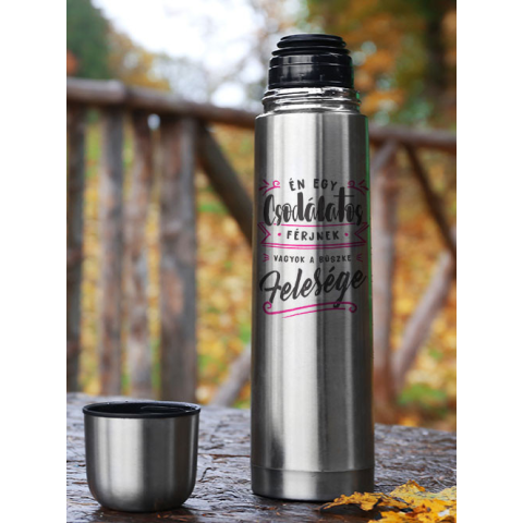 Ajándék nőknek, termosz büszke feleségnek. Én egy csodálatos férjnek vagyok a büszke felesége feliratos termosz születésnapra, anyák napjára, karácsonyra. Anyaga rozsda mentes acél és műanyag, 500ml-es és 750ml-es változatban elérhetőek. Stílusos és p