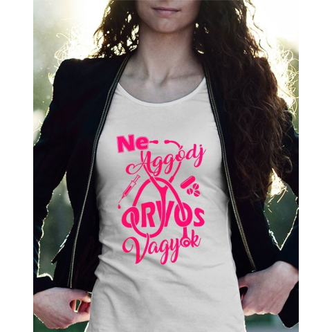 Ajándék orvosnak, orvos vagyok női póló. Ne aggódj, orvos vagyok feliratos póló nőknek. Legyen szó háziorvosról, kórházi dolgozóról vagy bárkiről aki egészségügyben dolgozik egy ilyen női pólónak bárki örülni fog. Válaszd ki a női póló méretét és színét é