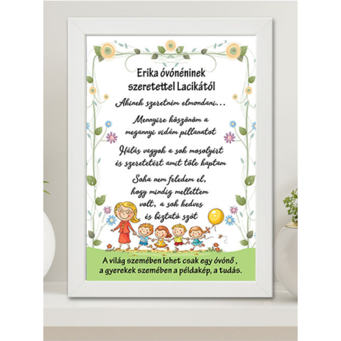 Ajándék óvónéninek ballagásra, Óvónénis falikép A3 méretben. Falikép, mely falra akasztható, minden lakás szívet melengető dekorációja. Köszönet ajándék óvónéninek. Falikép nagyobb méretben, mérete 30x40 cm, a keret és a háttér színe fehér.