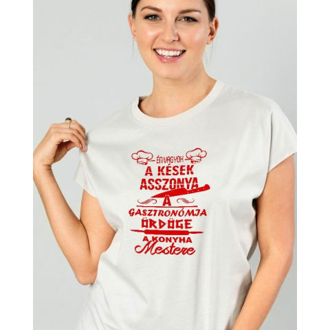 Női póló szakácsnőknek, kések asszonya női póló a kések asszonyának, a gasztronómia ördögének. Kiváló szülinapi, névnapi ajándék szakácsnőknek, konyhatündéreknek. Választható színű és méretű 100% pamut pólók. Kiváló minőségű férfi és női pólók, amelyek