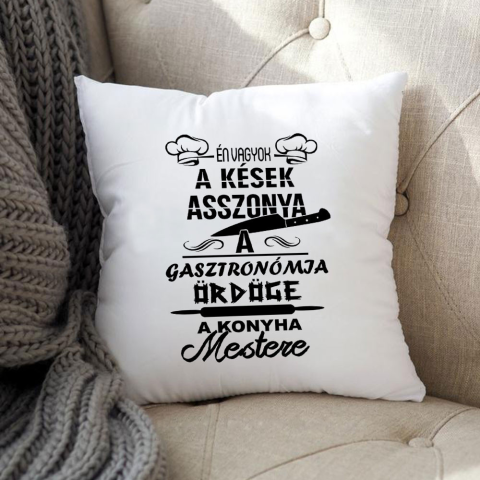 Ajándék szakácsnőknek, kések asszonya párna a kések asszonyának, a gasztronómia ördögének. Kiváló szülinapi, névnapi ajándék szakácsnőknek, konyhatündéreknek. A konyha dísze lehet ez a feliratos párna. A párna hátuljának színét Te választhatod ki. 40x40 c