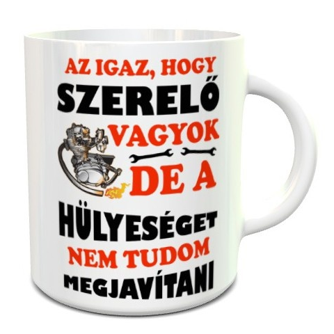 Vicces bögre szerelőnek, hülyeséget javítani. Az igaz, hogy szerelő vagyok, de a hülyeséget nem tudom megjavítani humoros feliratos bögre. Ajándék ezermestereknek, kerámia vagy zománc bögre, praktikus használati tárgy, de kiváló dekorációja lehet egy szer