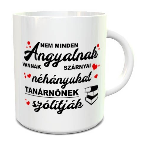 Ajándék tanárnőnek, bögre tanárnőnek. Nem minden angyalnak vannak szárnyai, néhányukat tanárnőnek szólítják bögre felirattal. Tökéletes pedagógus napi vagy ballagási ajándék a legfigyelmesebb tanárnőnek, osztályfőnöknek. Többféle szín, tökéletes ajándéköt