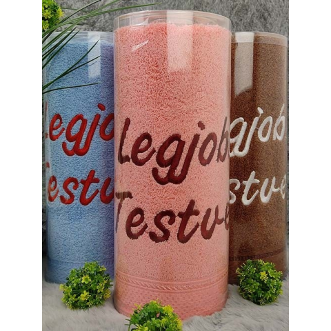 Ajándék testvérnek, Legjobb testvér törölköző hímzett felirattal. Ajándék testvéreknek születésnapra, névnapra, karácsonyra. A törölköző többféle színben elérhető, kiváló nedvszívó. Puha, 100 % pamut törölköző, mérete 70 x 140 cm. Műanyag henger csomagolá