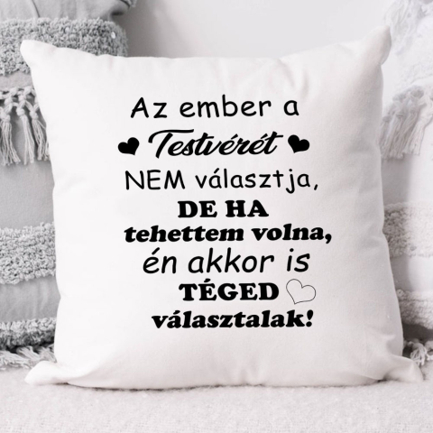 Ajándék testvérnek, tesós ajándék párna. Az ember a testvérét nem választja, de ha tehettem volna én akkor is Téged választalak. Születésnapra, névnapra lepd meg lány vagy fiú testvéredet egy szuper feliratos párnával. A párna mérete 40x40 cm, a huzat
