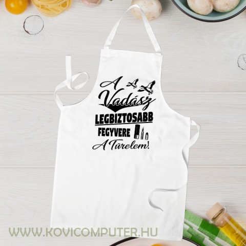 Kötény vadásznak, legbiztosabb fegyver. A vadász legbiztosabb fegyvere a türelem feliratos kötény vadászoknak. Ajándékozd meg vadász családtagod, barátod egy köténnyel és egy jó tanáccsal, amit minden vadásznak érdemes tudni. Kötény színe fekete vagy fehé