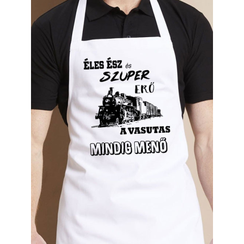 Ajándék vasutasnak, éles ész és szuper erő vasutas kötény. Vicces kötény vasutasnak, mozdonyvezetőknek. Egyetlen vasutas ruhatárából sem hiányozhat egy ilyen menő kötény, ami fekete vagy fehér színben is választható. Egyedi mintával ellátott kötényünk