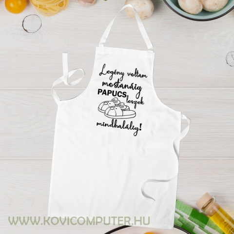 Ajándék vőlegénynek, kötény nősülő férfiaknak. Vicces kötény házasulandó szakácsoknak, vagy főzni szerető férfinak. Felirat: Legény voltam mostanáig, papucs leszek mindhalálig. A kötényt fekete színben, fehér mintával is rendelheted. Egyedi mintával el